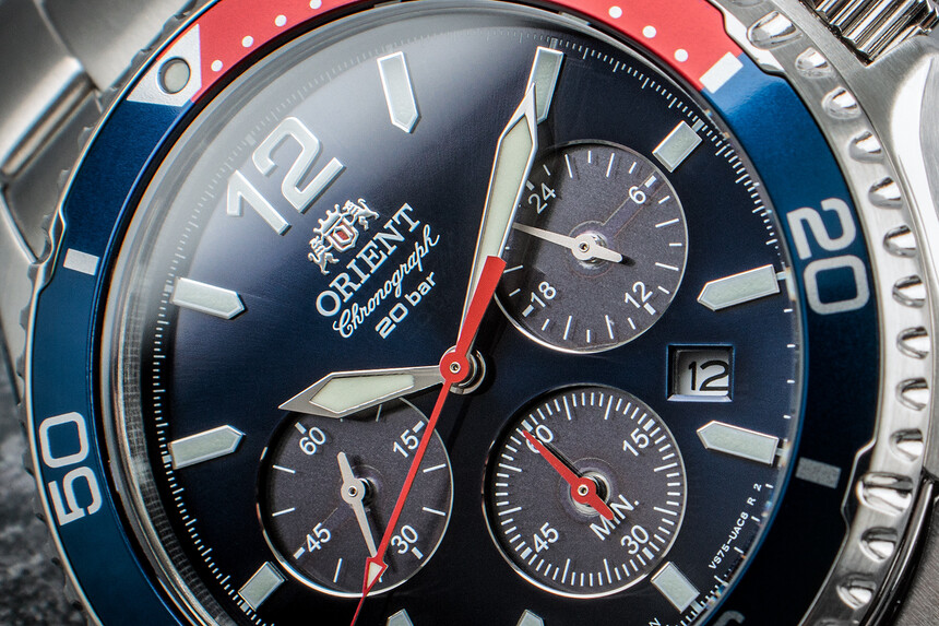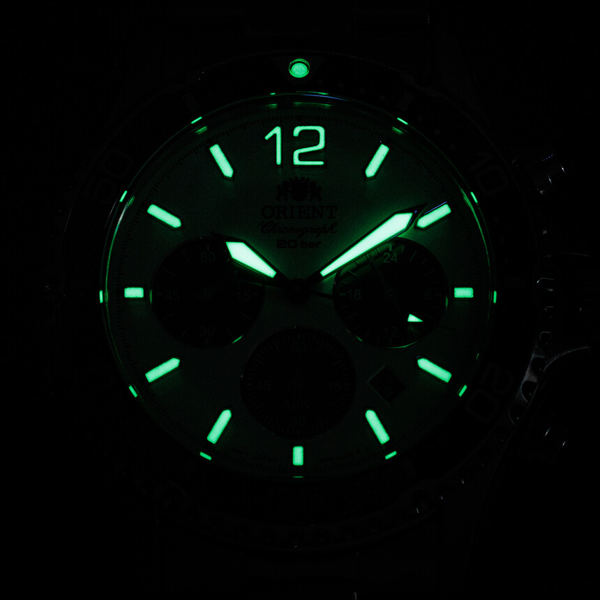 Klasszikus panda dizájn, a kronográf segédszámlapok szimmetrikus elrendezése és búvárórához méltó paraméterek. Ez az Orient Sports Solar.