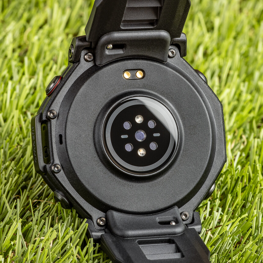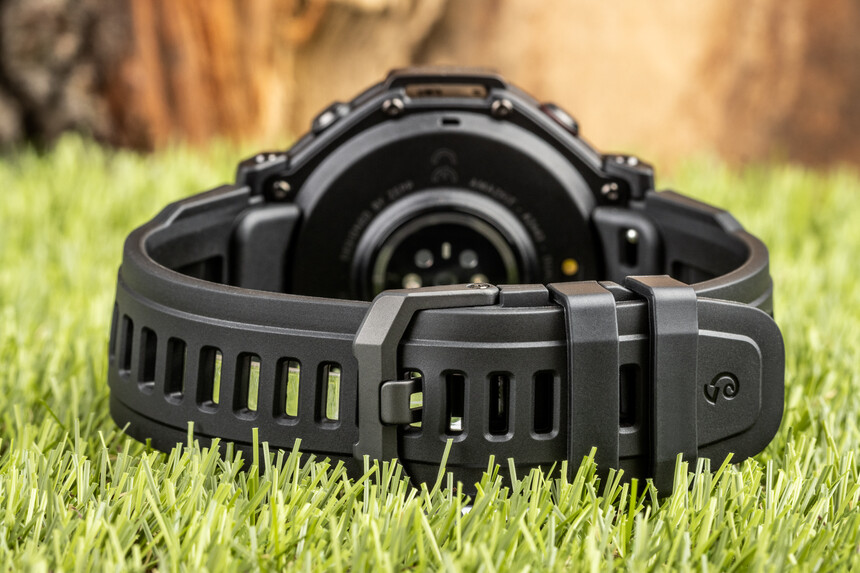Az órán minden fekete – a lünetta, a műanyag tok, a hátlap, a barométer és a hangszóró védelme is. És természetesen a 22 mm-es szilikonszíj sem kivétel. Éppen a szíjhoz fűznék azonban egy fontos megjegyzést. Ha visszatekintünk az összes korábbi generációra, mindegyik csavaros fülszeggel rögzítette a szíjat. A cseréhez tehát speciális csavarhúzó kellett. Ez elég megosztó volt – tökéletesen tartott, de a csere majdnem olyan érzést keltett, mintha autószervizben lennénk.