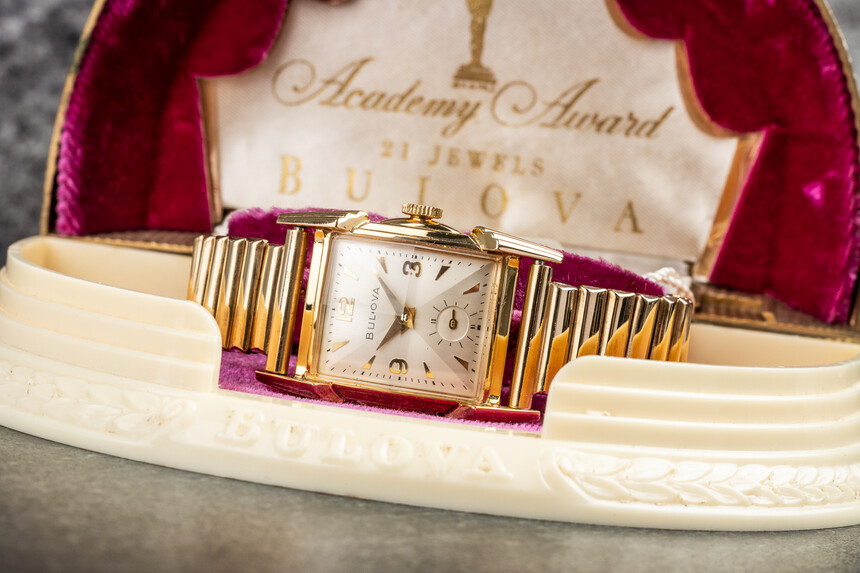 New Yorkból egy másik jelentős modell is érkezett, mégpedig a Bulova Academic Award. Már a doboza is sejteti, hogy valami exkluzívról van szó. A Bulova az 50-es évek elején különleges licencet vásárolt az Academy of Motion Picture Arts and Sciences-től. Ennek köszönhetően a Bulova négy éven át kizárólagosan gyárthatott Academic Award megjelölésű órákat, a híres díjátadóra utaló dizájnelemekkel. Az ilyen jelölésű órák a korabeli kínálat dizájncsúcsát és a képzeletbeli high-end kategóriát képviselték.