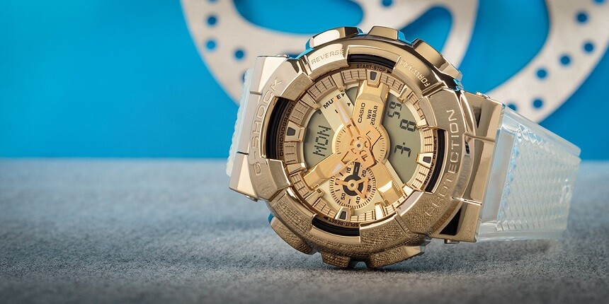 Ha azonban jobban megnézzük, itt is találunk néhány változást. A tipikus Ypsilon-alakú számlap új kikészítést kapott, és a tükörfényes fényezésnek köszönhetően egy kis fantáziával arany téglára hasonlít, a kis számlap pedig már nem tachiméter-jelzőként szolgál (ezt a funkciót talán még soha senki nem használta a GA-110-en :)), hanem stopper másodpercszámlálóként.