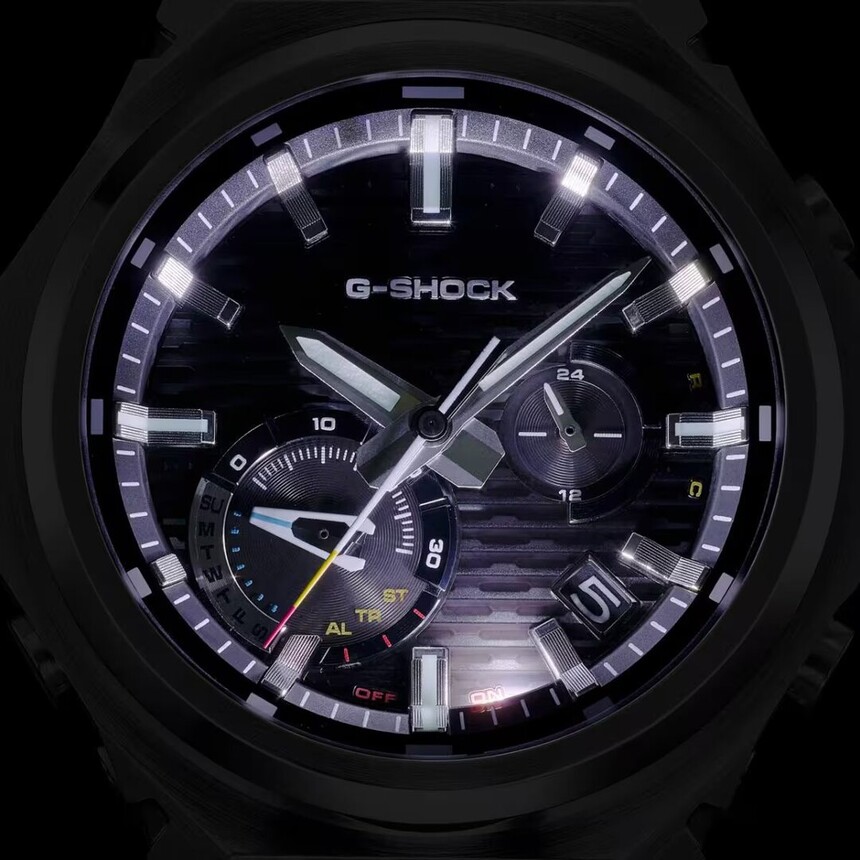 A számlap minimalizmusát két segédszámlap töri meg, de koncepcionálisan ez teljesen rendben van. Nélkülük nem lenne igazi G‑Shock. A bal alsó segédszámlap a funkciókijelző, vagyis azt mutatja, melyik üzemmódban van épp az óra. A jobb oldali segédszámlap AM/PM kijelzőként működik, tehát jelzi, hogy délelőtt vagy délután van. A segédszámlapok azok közé tartoznak, amelyeket látunk. Amit viszont nem, az a számlap alá rejtett napelem: a fényt gyűjti, és a hosszú, szinte gondozásmentes működésről gondoskodik.