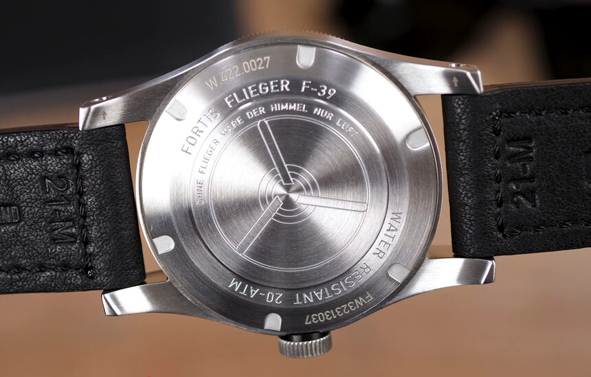 Az óra hátlapja egy gyönyörű részletet rejt. Itt a Fortis egy repülőgép-lapát motívumot helyezett el és a "Ohne Flieger wäre der Himmel nur Luft" feliratot helyezte el - vagyis lefordítva: "Repülők nélkül az égbolt csak levegő lenne". Mindez szimbolikusan zárja le az egész órát, emlékeztetve bennünket az eredetére és a céljára: hogy eszköz legyen azok számára, akik lenéznek a világra.