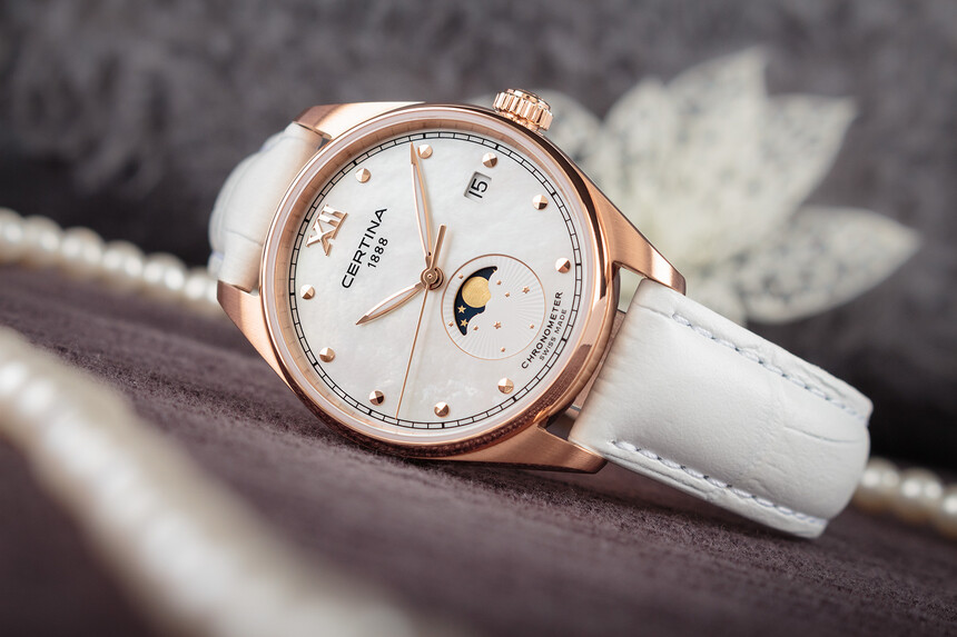 Nálunk a svájci Certina márka a legnagyobb szerelmese a Holdnak a számlapon, ahol a női szekcióban például a Certina DS-8 Lady Quartz COSC Chronometer Moon Phase-t találjuk fehér bőrszíjon.