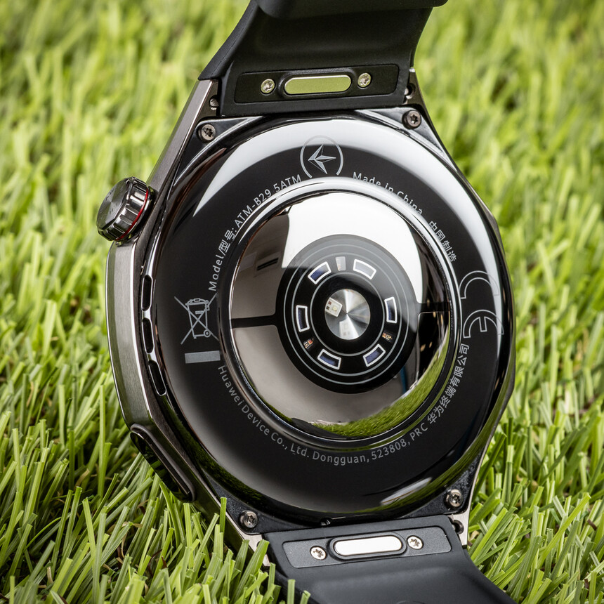 Az alsó oldalra pillantva a hátlapot látjuk a pulzusmérő szenzorral. A hátlap – ahogy korábban is – üveg. Ez elvileg kizárja a bőrrel kapcsolatos problémákat vagy allergiát, mivel az üveg antiallergén. A hátlapon a vízállóság is szerepel: 5 ATM, vagyis zuhanyzáshoz és úszáshoz is alkalmas.