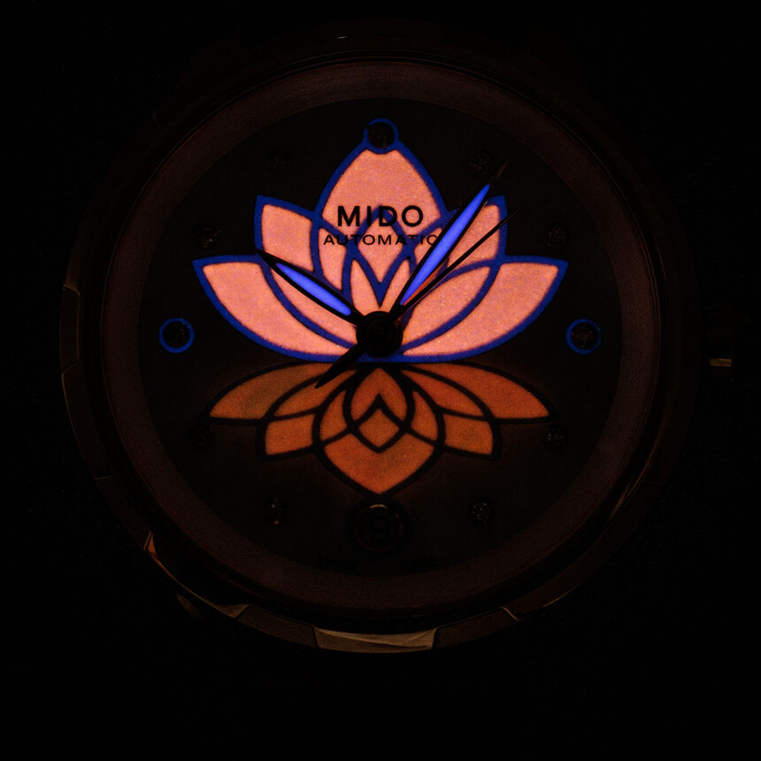 Lenyűgöz a különleges számlap lótusz-motívummal, rétegzett gyöngyházberakással és a rózsaszín, illetve kék árnyalataival, amelyek az esti fényt idézik a víz felszínén. Ráadásul a lumineszcencia megoldása sem mindennapi.