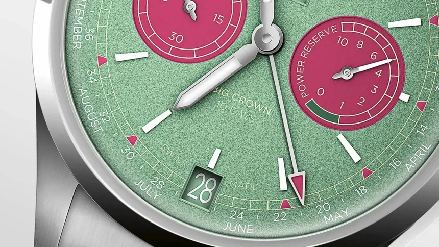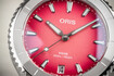 Első pillantásra természetesen a számlap színvilága ragad magával. Ez korántsem megszokott – és nem is véletlen. A választás a hagyományos órás szerszámok jellegzetes zöldjére utal, kifejezőbb, melegebb rózsaszínnel párosítva, fukszia–málnás árnyalattal. Az Oris azonnal magára vonja a figyelmet, és határozottan pozitív érzelmeket kelt.