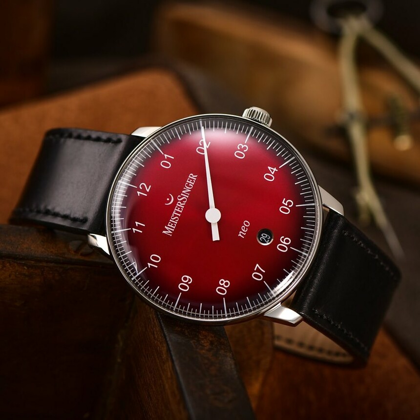 A Metris kollekció például könnyen felismerhető a tok különleges formájának köszönhetően. Ezenkívül 200 méteres vízállósággal és kellemes 38 mm-es átmérővel rendelkezik. A Neo kollekció viszont keskeny lünettájával vonzza a tekintetet, ami kiemeli a számlapot, különösen az eredeti piros színű modellnél, amely a MeisterSinger 2021-es év színe lett. Ez is azon kevesek egyike, amelyek műanyag üveggel rendelkeznek, hogy fokozzák a retró hatást.
