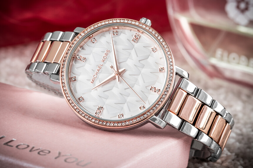 A másik a finomabb Pyper, amely kétféle fém tónust, cirkóniákat és ikonikus MK logót kombinál a számlapon.