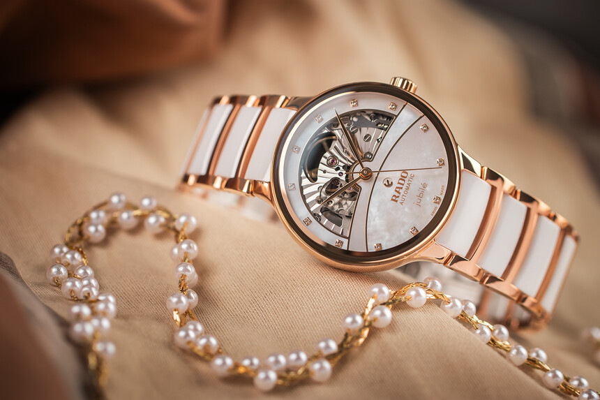 Kezdjük egy Rado modellel gyémántokkal, gyöngyházzal, de főként átlátszó hátlappal, rálátással a szerkezetre, és kerámia szíjjal. Elegancia, az órás mesterség bemutatása és csodás kiegészítő – például gyöngy fülbevaló mellé.