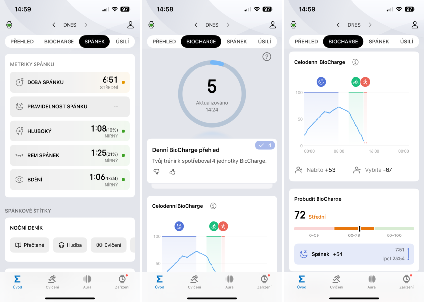Említést érdemel a BioCharge funkció, amely egyszerűen kiértékeli a tested energiaszintjét. Rossz alvás, magas stressz vagy nagy edzésterhelés? Az érték csökkenhet — és fordítva. Természetesen mindig az érzéseid a legfontosabbak, de ha a BioCharge alacsony, és te sem érzed jól magad, nem baj, ha adsz rá. Lényegében a felkészültség jelzője.