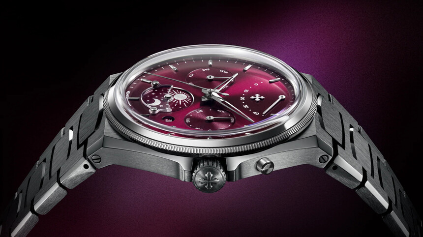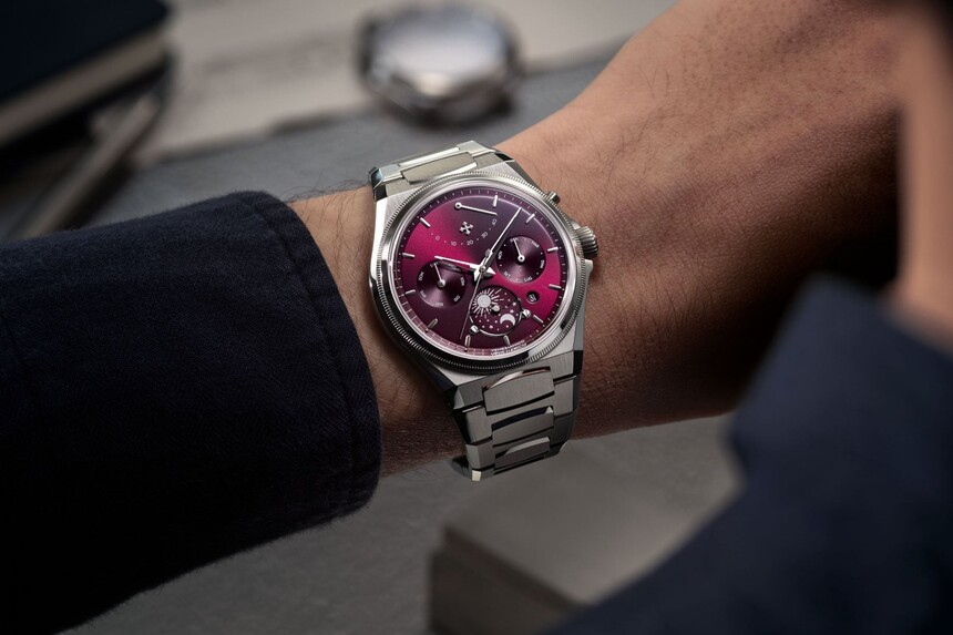 A számlap háttere visszafogott, finom sunburst csiszolással; a kínálatban telített bordó változat és a hagyományosabb királykék is elérhető.