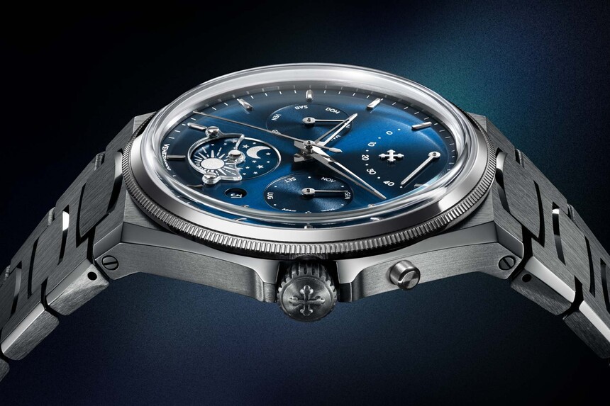 A kellemes arányok és az integrált karkötő dizájnja kompakt, és feltehetően jól viselhető tokformát eredményez. Különösen a vékony, részben rovátkolt lünetta és a bőkezűen lecsapott tokél miatt, amely zökkenőmentesen fut bele az elkeskenyedő karkötőbe.