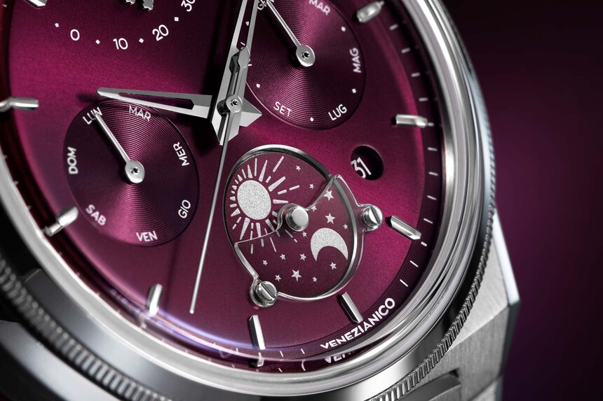 A Venezianico Arsenale Calendario triplanaptáros óra. Ez annyit tesz: klasszikus dátumablak, a hét napjának és az év hónapjának kijelzése. Emellett van egy nyomtatott nappal/éjszaka indikátor a megszokott égi motívumokkal, valamint járástartalék-kijelző is.