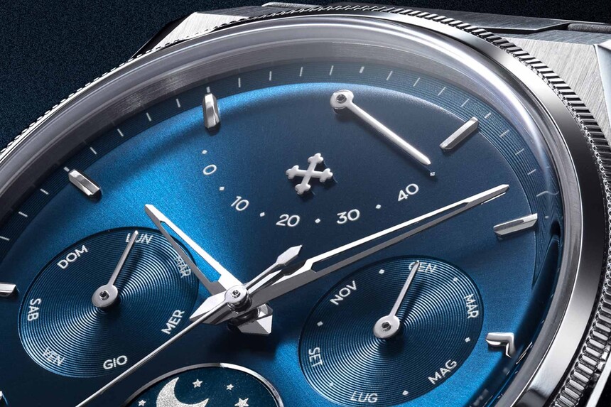 Az Arsenale Calendario egyelőre csak 40 mm-es átmérővel készül, nincs tehát 37 mm-es párja. A számlap optikailag nagyobbnak, mintha „széltől szélig” széthúzottnak hatna, a meglehetősen vékony lünetta miatt. A tok vastagsága mindössze 9,6 mm, ami automata óránál valóban nagyon szép érték, nemhogy ennyi komplikáció mellett. A lug to lug hossza pedig 44 mm.