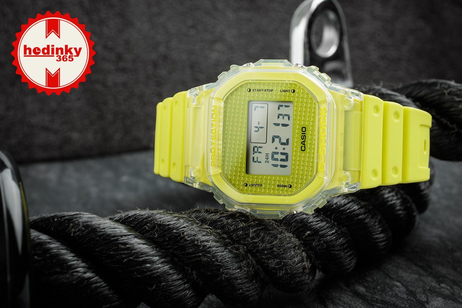 Ma a kevéssé használt EL világítás, amely gyönyörűen megvilágítja a teljes digitális kijelzőt + a gyantát, amelyből az óra készült, számos együttműködés előtt nyitja meg az utat. A logó például elrejthető a digitális kijelző alá, amely csak akkor jelenik meg, ha a háttérvilágítás be van kapcsolva. A gyanta ezután végtelen színkombinációs lehetőségeket kínál. A modellt számtalan különböző változatban láttuk már.