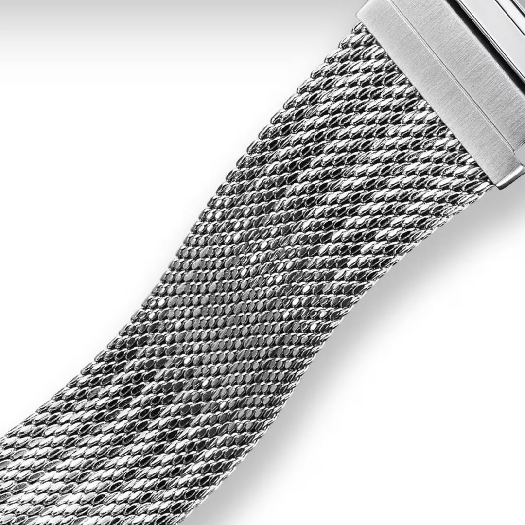 Ami egy kicsit félrevezető lehet, az a fém használata. Első pillantásra úgy tűnik, hogy az óra teljes egészében acélból készült. Közelebbről megvizsgálva azonban kiderül, hogy maga az óraház gyantából készült, amely csak krómozott. Ami a karkötőt illeti, az tiszta sebészeti acél, más néven 316L. A karkötő csúszócsattal is fel van szerelve. Így ha be kell állítania a hosszát, nem kell az órásmesterhez mennie, hanem ezt egy pillanat alatt, kényelmesen, otthonában is megteheti.