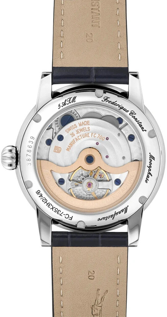 Mechanikus, automatikus tekercseléssel. Frederique Constant FC-735, Teljesítménytartalék 50h, 28.800 BPH (4Hz), 32 köveket, Hackelés