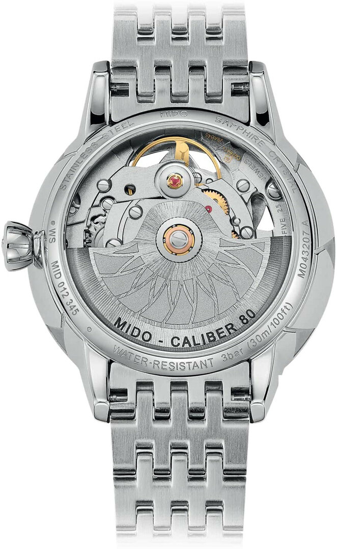 Mechanikus, automatikus tekercseléssel. Mido Caliber 80 építve a ETA C07.621 építve a ETA 2836-2 építve a ETA 2824-2, Teljesítménytartalék 80h, 21.600 BPH (3Hz), 25 köveket