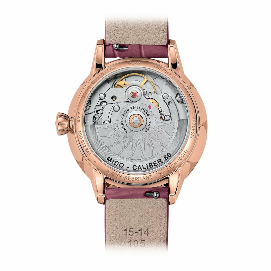 Mechanikus, automatikus tekercseléssel. Mido Caliber 80.611 építve a ETA C07.611 építve a ETA 2824-2, Teljesítménytartalék 80h, 21.600 BPH (3Hz), 25 köveket