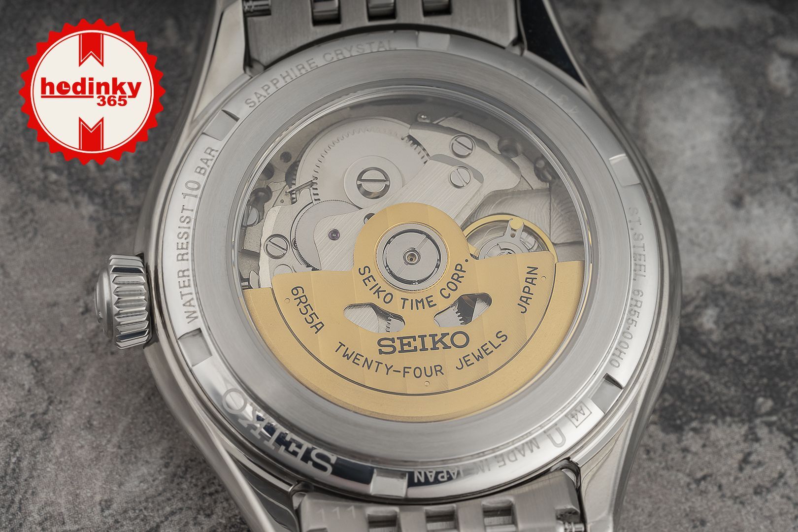 Mechanikus, automatikus tekercseléssel. Seiko 6R55, Teljesítménytartalék 72h, 21.600 BPH (3Hz), 24 köveket, Hackelés, Kézi felhúzás lehetőség