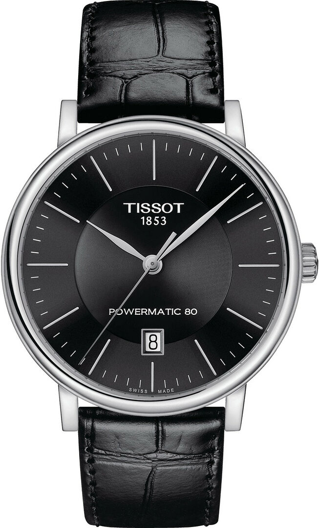 A Tissot Carson Automatic letisztult és konzervatív esztétikáját fokozza a számlap egyszerűsége, amely elegáns levélmutatókkal, egyszerű, hosszúkás indexekkel vagy (a prémium modelleken) hivatalos római számok, amelyek a betűtípus robusztusabb szerif stílusának köszönhetően kissé vintage hangulatot kaptak. Egy másik érdekes részlet a hatodik pozícióban lévő, finom fémkerettel ellátott dátumablak. Az óra kifinomultságát a 40 mm-es átlagos méret is fenntartja, ami ideális formális és alkalmi órákhoz.